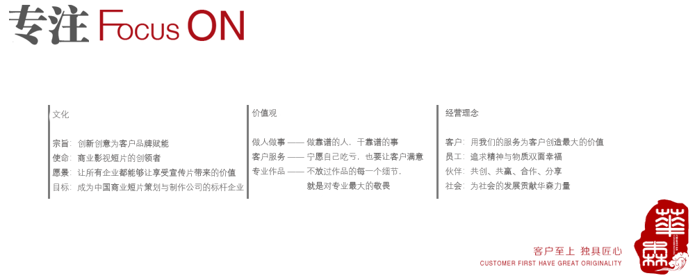 秉承“客戶為上”的原則,以市場為導向,以“視頻營銷戰(zhàn)略”為教程,讓每一部影片的作用發(fā)揮到極致。
